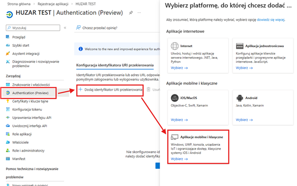 - w sekcji Identyfikator URI przekierowania, w polu wybierz platformę zaznacz Klient publiczny/natywny,