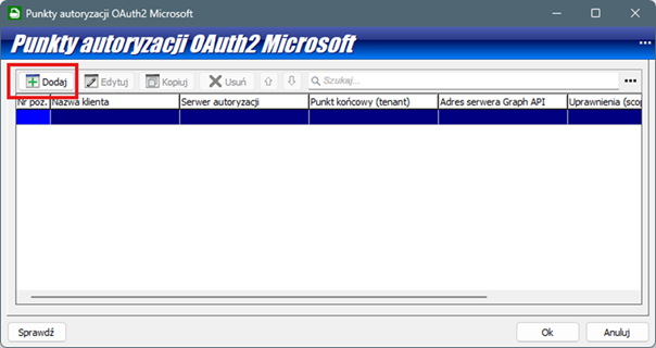 - W oknie Punkty autoryzacji OAuth2 Microsoft kliknij przycisk Dodaj.