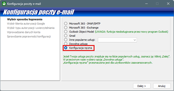- Po nadaniu odpowiednich uprawnień uruchom kreatora tworzenia konta e-mail i wybierz opcję Konfiguracja ręczna i kliknij przycisk Dalej.