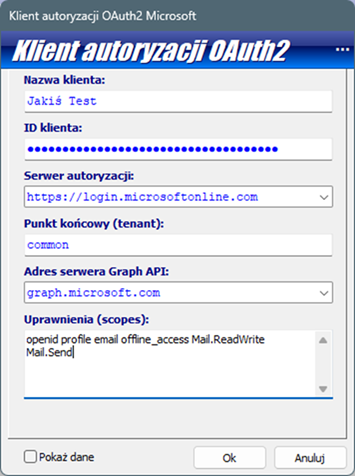 - Uzupełnij dane w oknie Klient autoryzacji OAuth2: