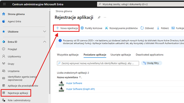 Konfiguracja aplikacji w Microsoft Entra ID musi być przeprowadzona przez użytkownika Azure z rolą „Administrator aplikacji”.