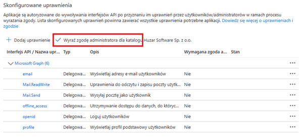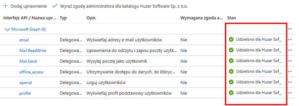 - Ważne: po skonfigurowaniu uprawnień kliknij przycisk Wyraź zgodę administratora dla[…]. Bez tej zgody uprawnienia nie będą miały zastosowania. Na poniższym obrazku znajduje się zestaw uprawnień wystarczający do autoryzacji oraz odbierania i wysyłania poczty za pomocą Exchange (tylko we własnym imieniu).