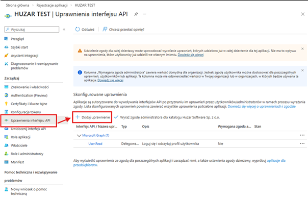 Ze względu na polityki bezpieczeństwa stosowane w niektórych firmach lub korzystanie przez użytkowników ze środowisk Microsoft 365 w domenach innych niż .com (np. w domenie .us) dostęp do predefiniowanych w aplikacjach Huzar Software punktów dostępu może być niemożliwy. Takie przypadki mogą być obsłużone przez samodzielną konfigurację punktów dostępu przez użytkownika z wykorzystaniem własnych rejestracji aplikacji w Microsoft Entra ID.