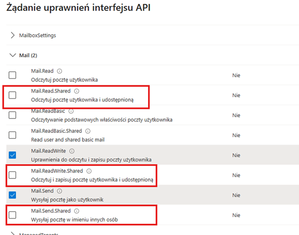 - odbieranie i wysyłka poczty za pomocą Exchange wymagają uprawnień: email, ReadWrite, Mail.Send