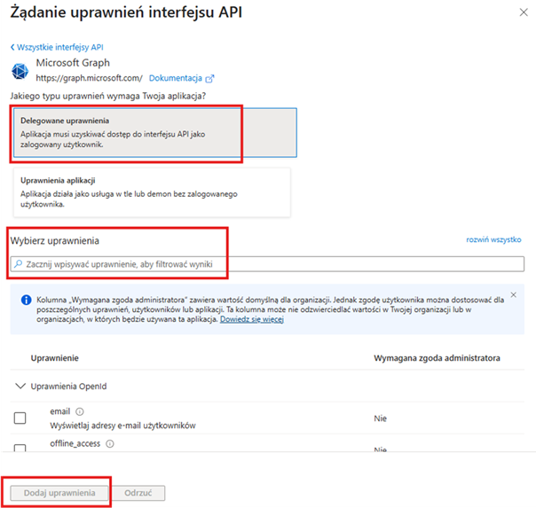 - Po zarejestrowaniu aplikacji przejdź do sekcji Uprawnienia interfejsu API i skonfiguruj uprawnienia niezbędne do autoryzacji użytkownika oraz do odbierania i wysyłania wiadomości e-mail: