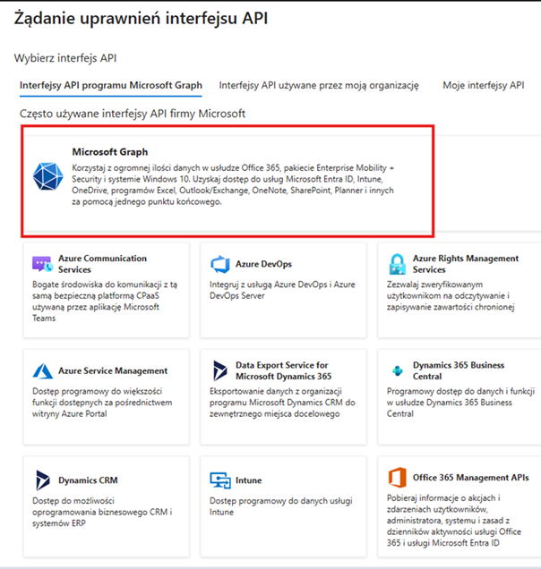 - Po kliknięciu przycisku Dodaj uprawnienie zostanie wyświetlone okno „Żądanie uprawnień interfejsu API”. Kliknij w nim pole Microsoft Graph.